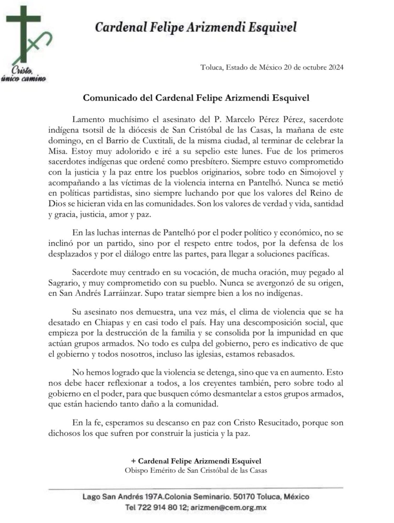 📍 #Comunicado | La Compañía de Jesús condena el asesinato del sacerdote Marcelo Pérez Pérez, párroco de la Iglesia de Guadalupe en San Cristóbal de las Casas. Rechazamos cualquier intento de minimizar estos hechos como casos aislados y hacemos un llamado urgente a las… pic.twitter.com/uhJCQWa855
