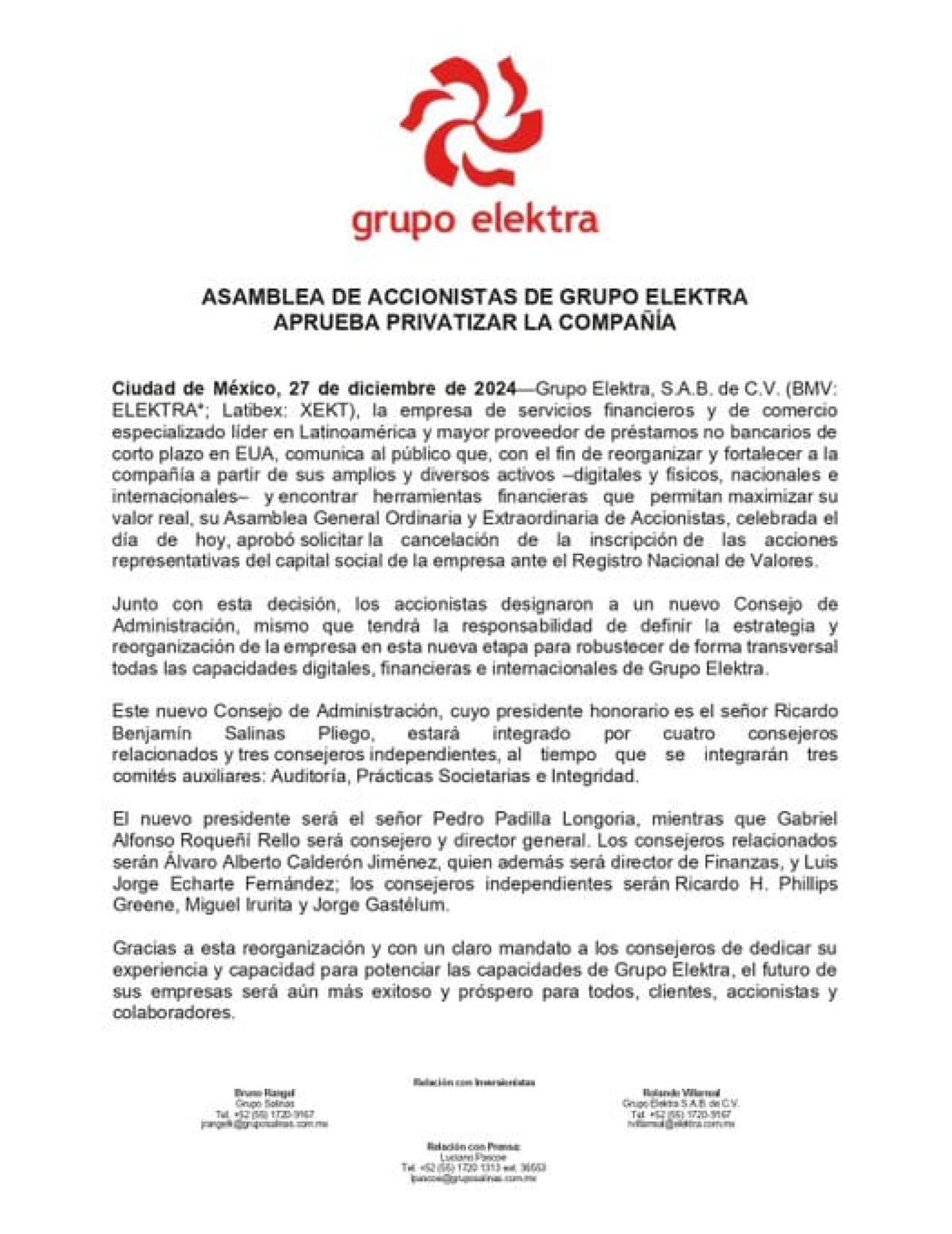 De acuerdo con la compañía propiedad del empresario Ricardo Salinas Pliego, junto con esta decisión, los accionistas designaron a un nuevo consejo de administración, mismo que tendrá la responsabilidad de definir la estrategia y reorganización de la empresa en esta nueva etapa para robustecer de forma transversal todas las capacidades digitales, financieras e internacionales de Grupo Elektra.