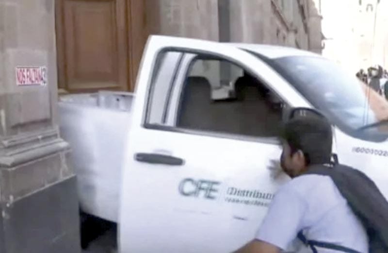 Así el impacto, con la camioneta de la CFE, en la Puerta de Acceso 1 de Palacio Nacional, sobre la calle de Moneda, en la irrupción por parte de presuntos normalistas