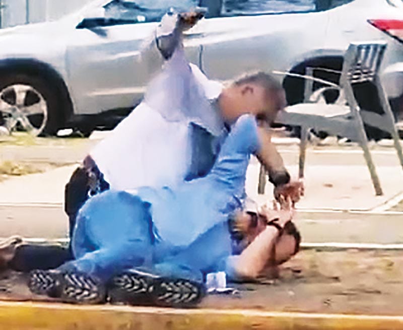 Durante la gresca, Paulo Enrique ya se encuentra noqueado en el suelo y el sujeto que lo agrede insiste en golpearlo con la manopla en la cabeza.