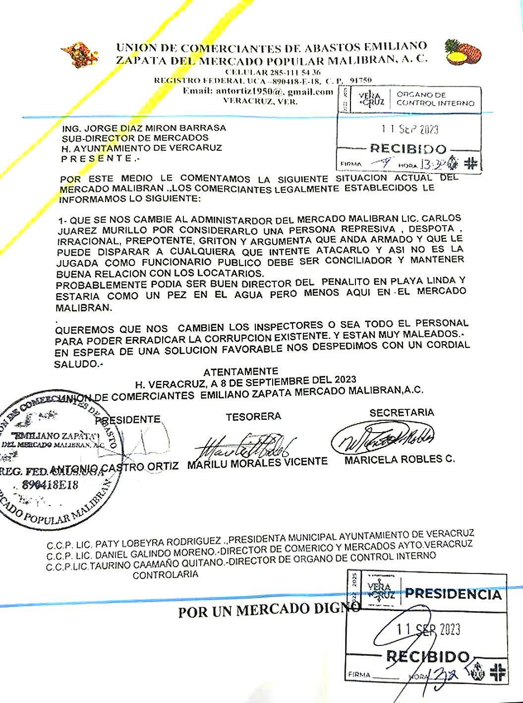 La Unión de Comerciantes de Abastos Emiliano Zapata del Mercado Popular Malibrán, del puerto de Veracruz, que encabeza Antonio Castro Ortiz, solicitó mediante oficio la destitución del administrador Juárez Murillo.