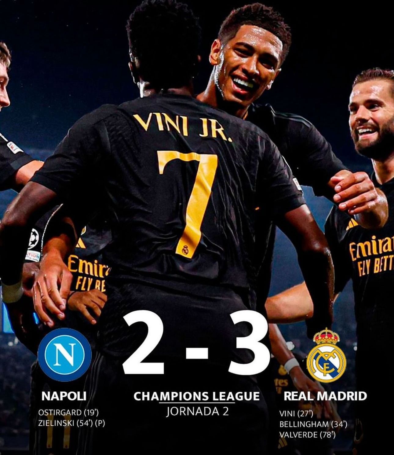Siempre acompañado de la épica en la Liga de Campeones, con un misil de Fede Valverde en los compases finales y una exhibición superlativa de Jude Bellingham, el Real Madrid ganó (2-3) en la casa de Maradona al Nápoles, su rival más difícil del grupo, para colocarse líder en solitario del C con dos victorias.