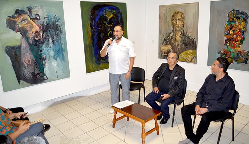 Durante el conversatorio, estuvo acompañado por Erik Castillo, curador de la exposición y encargado del texto de sala y César Segura, titular del recinto; entre el público se encontrada la secretaria de Cultura, Silvia Alejandre Prado.