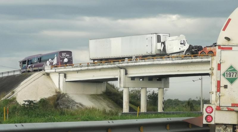 Un autobús de ADO GL que cubría la ruta Ciudad del Carmen-Veracruz chocó contra un tractocamión sobre carretera Coatzacoalcos-Villahermosa, en jurisdicción del municipio de Agua Dulce, con saldo de 20 lesionados, dos graves.