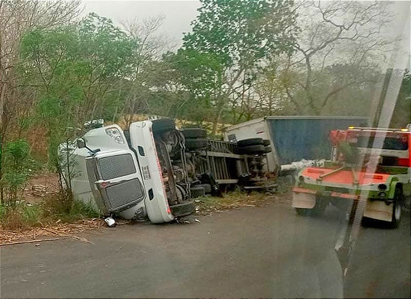 Un tráiler de la empresa Corona volcó sobre la carretera federal, a la altura de la comunidad de Loma Alta, en el municipio de Tierra Blanca, dejando como saldo cuantiosos daños materiales.