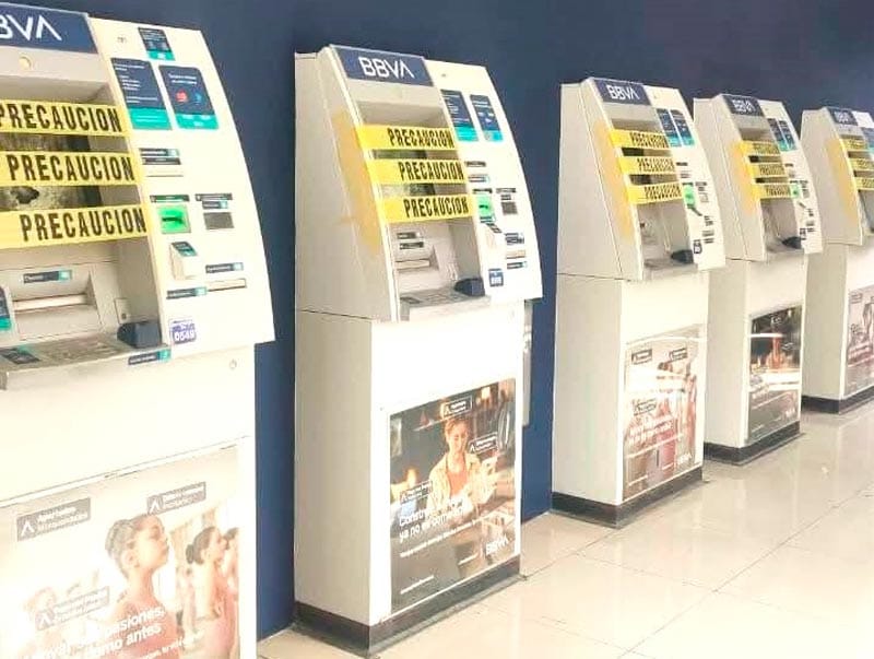 Ya para la mañana del jueves, personal del BBVA había instalado en cajeros vandalizados la cinta de “precaución”, alertando a cuentahabientes y usuarios que los cajeros estaban fuera de servicio.