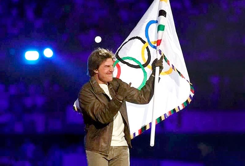 Tom Cruise hizo una aparición estelar, bajó en caída libre desde las estructuras de Stade de France y en un video pregrabado llevó la bandera olímpica hasta Hollywood, el letrero famoso vestido con los Aros olímpicos, recorrió el Memorial Coliseum y llegó hasta sus playas californianas, donde el ícono musical del sur de California Snoop Dogg entonó vibrante.