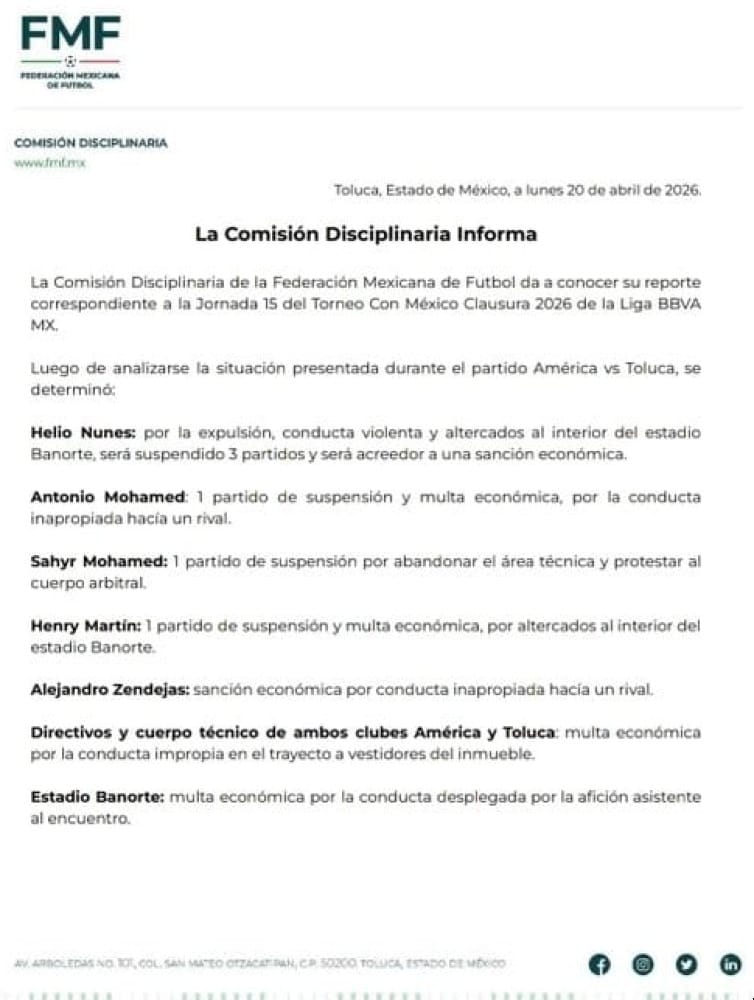 Henry Martín, quien continúa lesionado y ni siquiera estaba en la convocatoria para ese duelo, también recibió un partido de castigo y una multa debido al enfrentamiento que tuvo con Helinho en su camino a los vestidores, luego de que el jugador escarlata saliera de la cancha por una tarjeta roja.