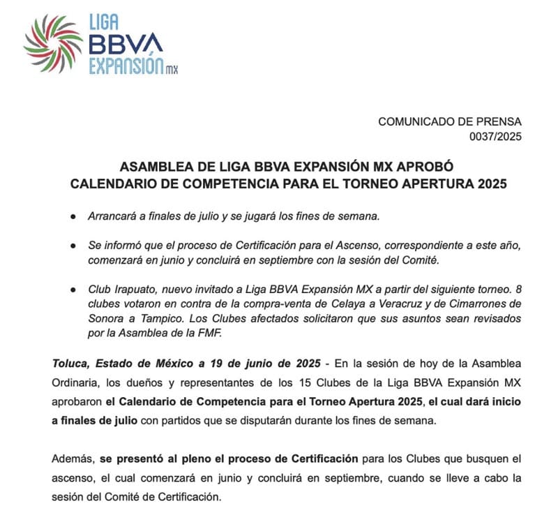 Mientras que la Certificación para los Clubes que busquen el ascenso, comenzará en junio y concluirá en septiembre, cuando se lleve a cabo la sesión del Comité de Certificación.