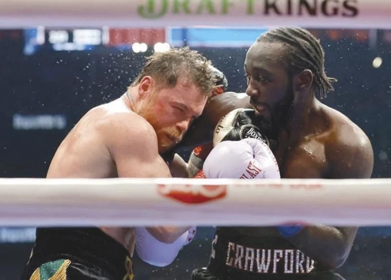 “Canelo” sale a noquear, pero no conecta y recibe mucho castigo, Crawford incluso se da el gusto de intentar noquear al final.