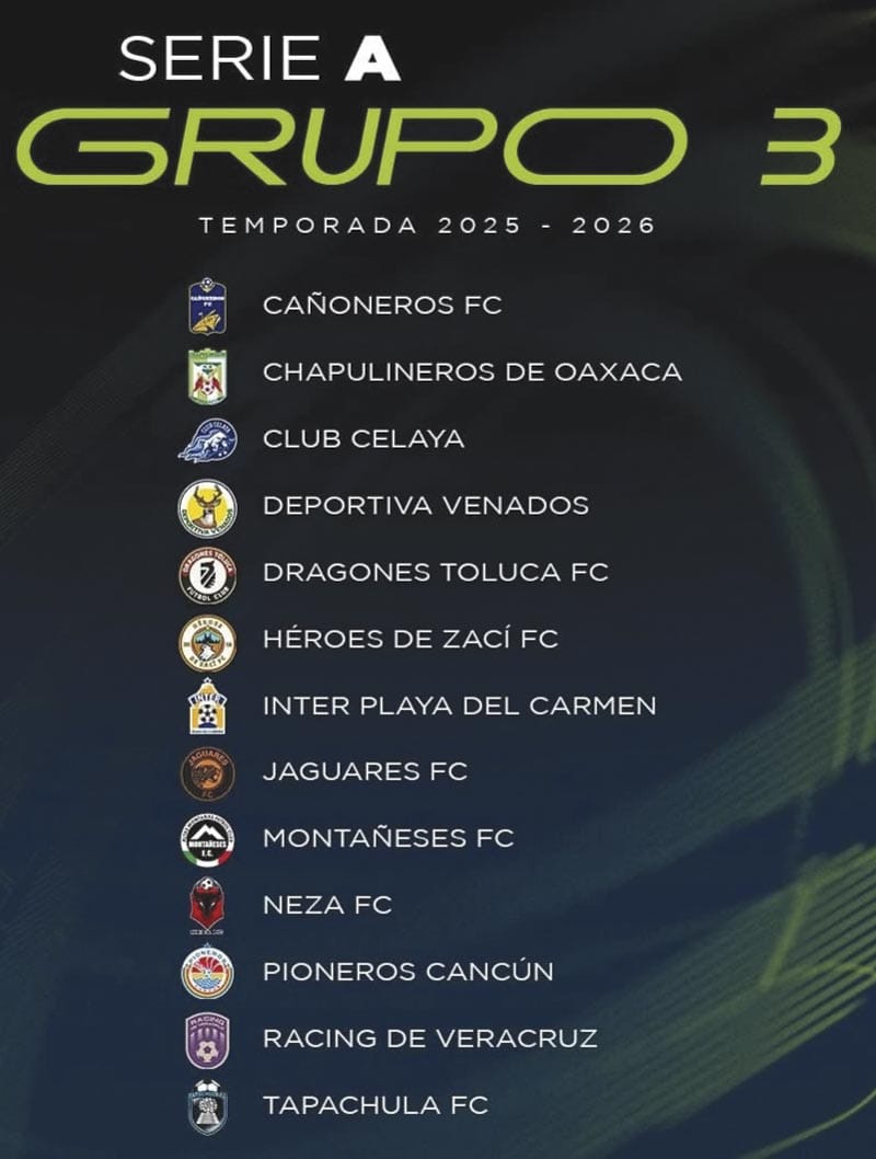 La Liga Premier Serie “A” se alista para el arranque de su nueva temporada y Cañoneros se encuentra en el Grupo 3 donde compartirá escena con Chapulineros de Oaxaca, Club Celaya, Club Celaya, Deportiva Venados, Dragones Toluca FC, Héroes de Zaci FC, Inter Playa del Carmen, Jaguares FC, Montañeses FC, Neza FC, Pioneros Cancún, Racing de Veracruz y Tapachula FC.