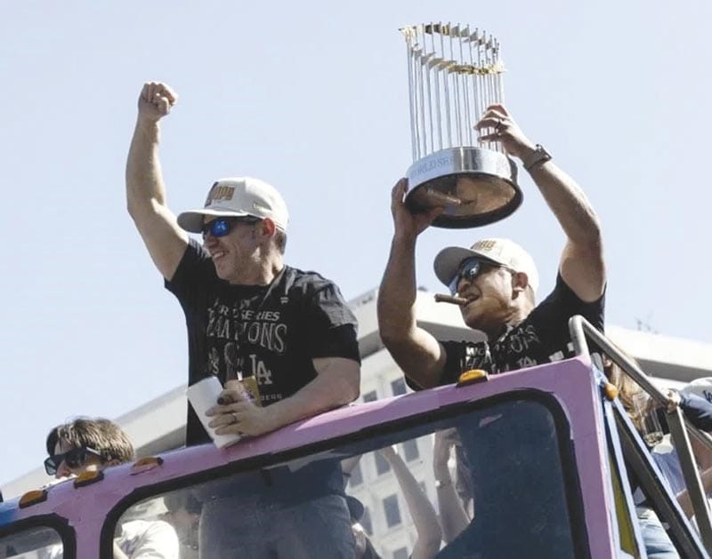 Walker Buehler, quien lanzó la novena entrada del último juego de la Serie Mundial, bebió cerveza con un embudo portando la camiseta de Orel Hershiser, quien fue parte del equipo campeón de 1988.