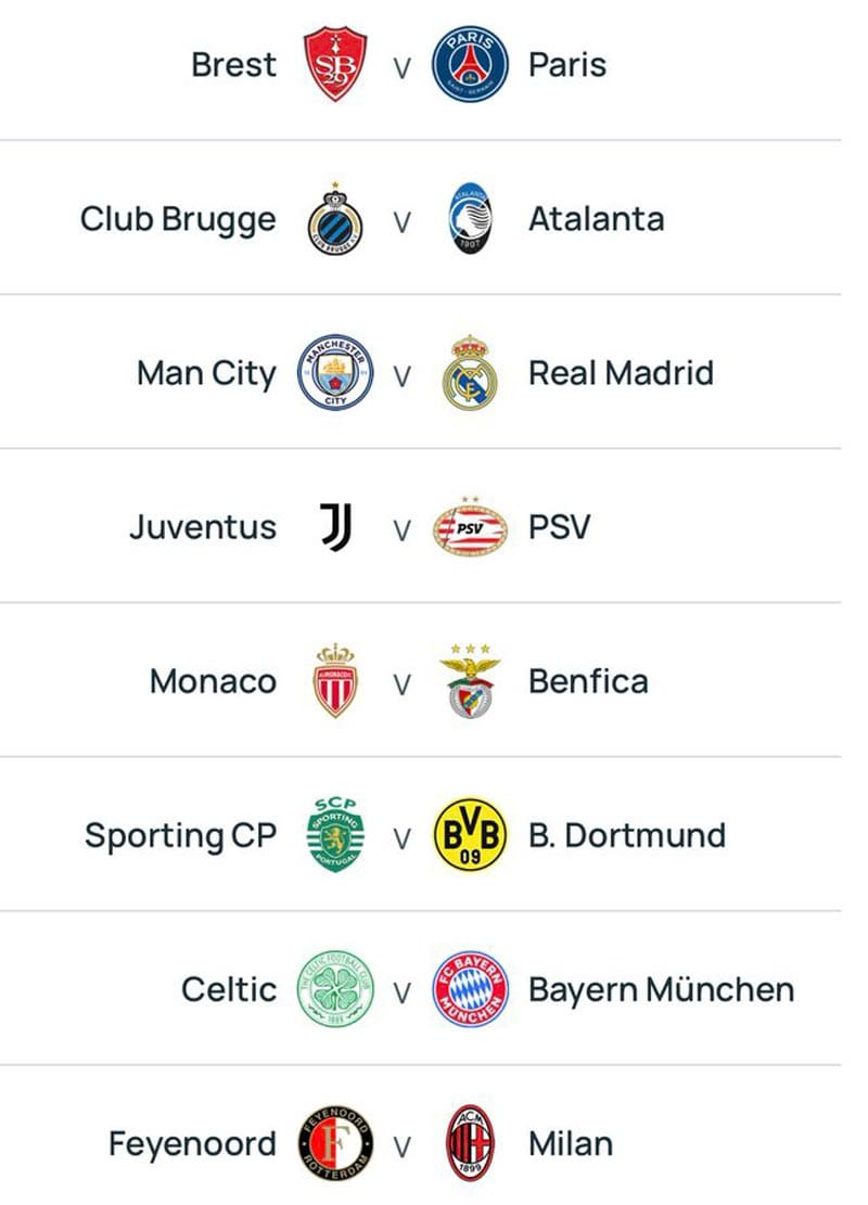 Y los cruces por los últimos ocho boletos son los siguientes: Celtic FC vs. Bayern Múnich; Mónaco vs. Benfica; Stade Brestois vs. PSG; Brujas vs. Atalanta; Sporting Lisboa vs. Dortmund; Feyenord vs. Milán; Juventus vs. PSV; y Manchester City vs. Real Madrid.