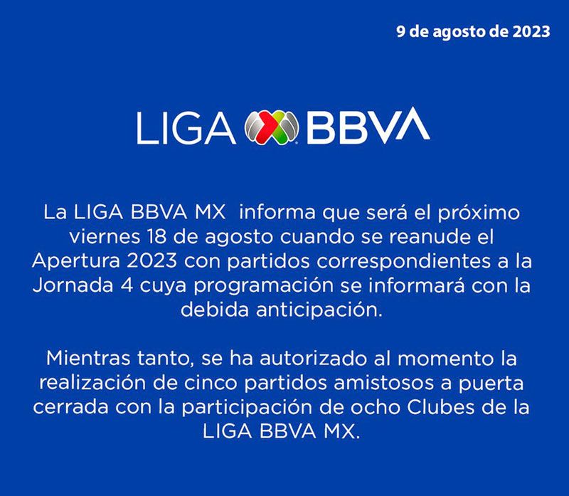 La Liga MX tras la pausa que tuvo el torneo Apertura 2023 para que sus equipos participaran en la Leagues Cup edición 2023 y donde solamente quedan dos equipos con vida como son Gallos de Querétaro y Rayados de Monterrey, hizo oficial que el torneo se reanudará a partir del próximo viernes 18 de agosto, independiente a que dichos equipos mexicanos sigan compitiendo en el torneo avalado por la CONCACAF.