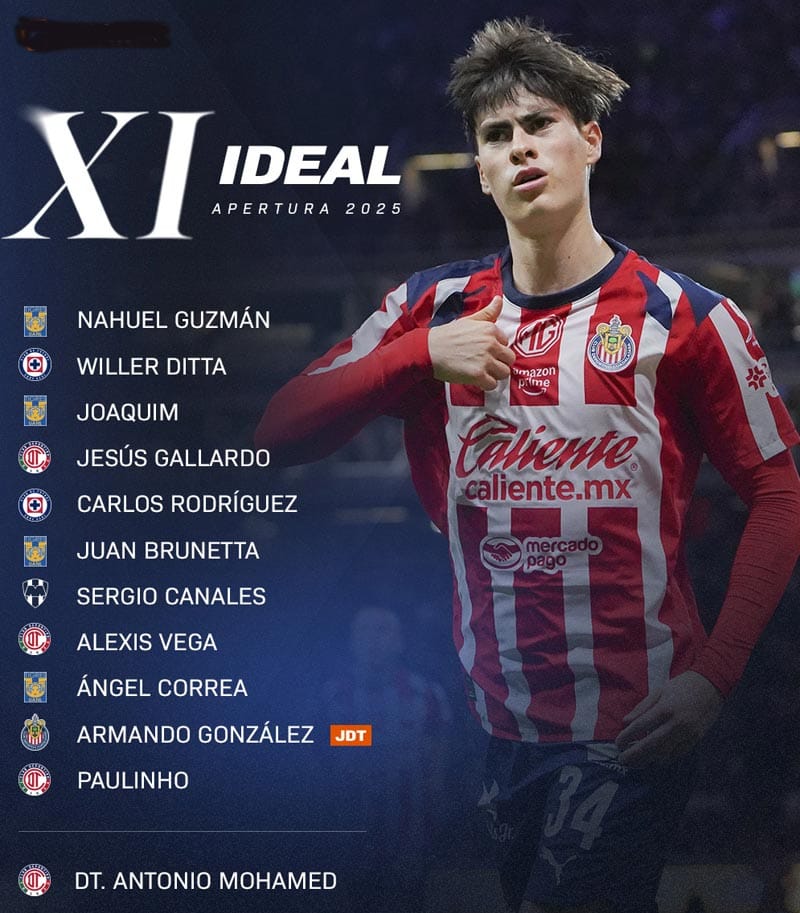 Otro equipo con presencia notable son los Tigres, el finalista y subcampeón, cuatro de sus jugadores están entre lo más destacado del Apertura 2025: Nahuel Guzmán, Joaquim, Juan Brunetta y Ángel Correa.