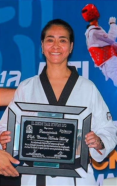El exseleccionado nacional, Jaime Málaga Zúñiga, director de Il Shim Taekwondo, entregó un merecido reconocimiento a Carmen Morales Muñoz, ésta lo recibió de manos de los pequeños Rodrigo Bauza Zamudio y Aurelio Cruz Altamirano.