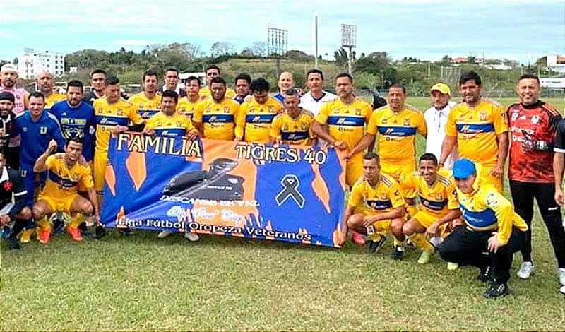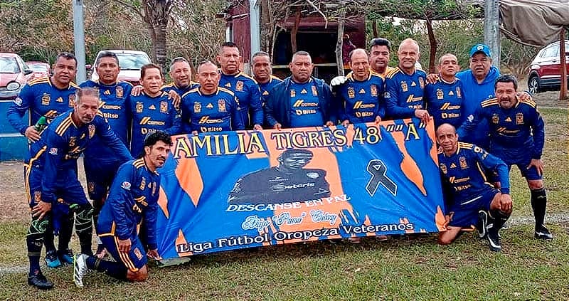 A manera de homenaje póstumo y reconocimiento, la familia de la organización Tigres que toma parte en tres categorías en la Liga de Futbol de Veteranos “Prof. Roberto Oropeza González” portó una lona con el nombre del futbolista veracruzano, el gran Diego “Puma” Chávez quien murió en la semana en un trágico accidente en Ciudad Juárez donde jugada para Bravos.