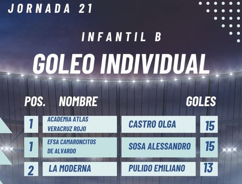 En la Infantil B también hubo un empate, Olga Estefanía Castro Carlin de Academia Atlas Veracruz y Alessandro Sosa Sena de EFSA Camaroncitos anotaron ambos 15 goles.
