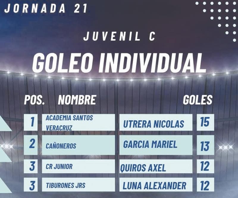 En la Juvenil C el Campeón de Goleo es Nicolás Utrera de Academia Santos Veracruz con 15 goles.