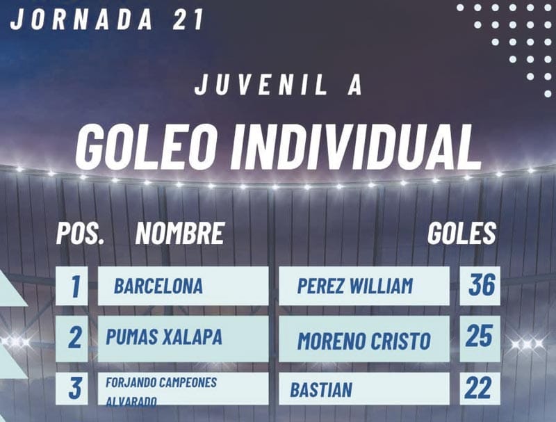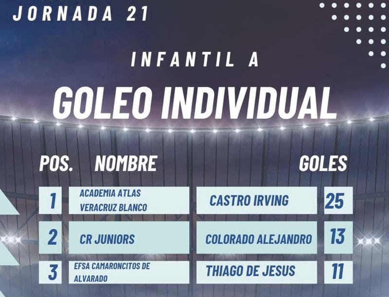 En la Infantil A el Rey del gol es Irving Castro Carlin de Academia Atlas Veracruz con 25 tantos.