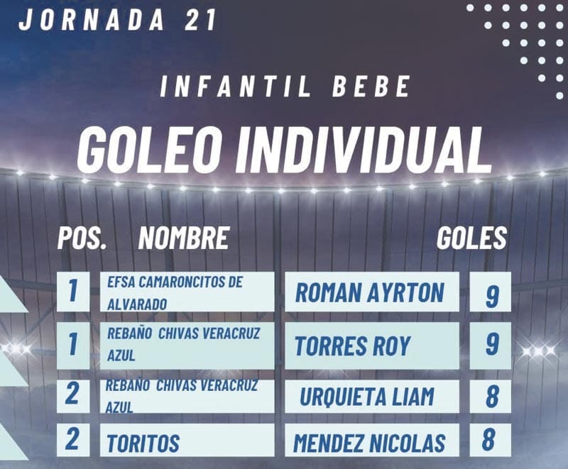 En la Infantil BB hubo un empate, Ayrton Román Pastelin de EFSA Camaroncitos y Sebastián Torres Roy de Rebaño Chivas Veracruz cerraron ambos con 9 tantos.