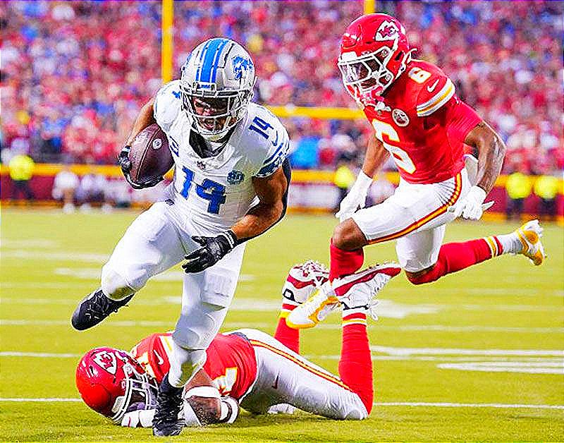 Amon-Ra St. Brown tuvo seis recepciones para 71 yardas y una anotación, y el novato de los Leones, Brian Branch, devolviera el primer balón interceptado de Patrick Mahomes, en un partido de 50 yardas, para otro touchdown, logrando así que Detroit cortara la racha de ocho victorias consecutivas de los Jefes en la Semana 1.