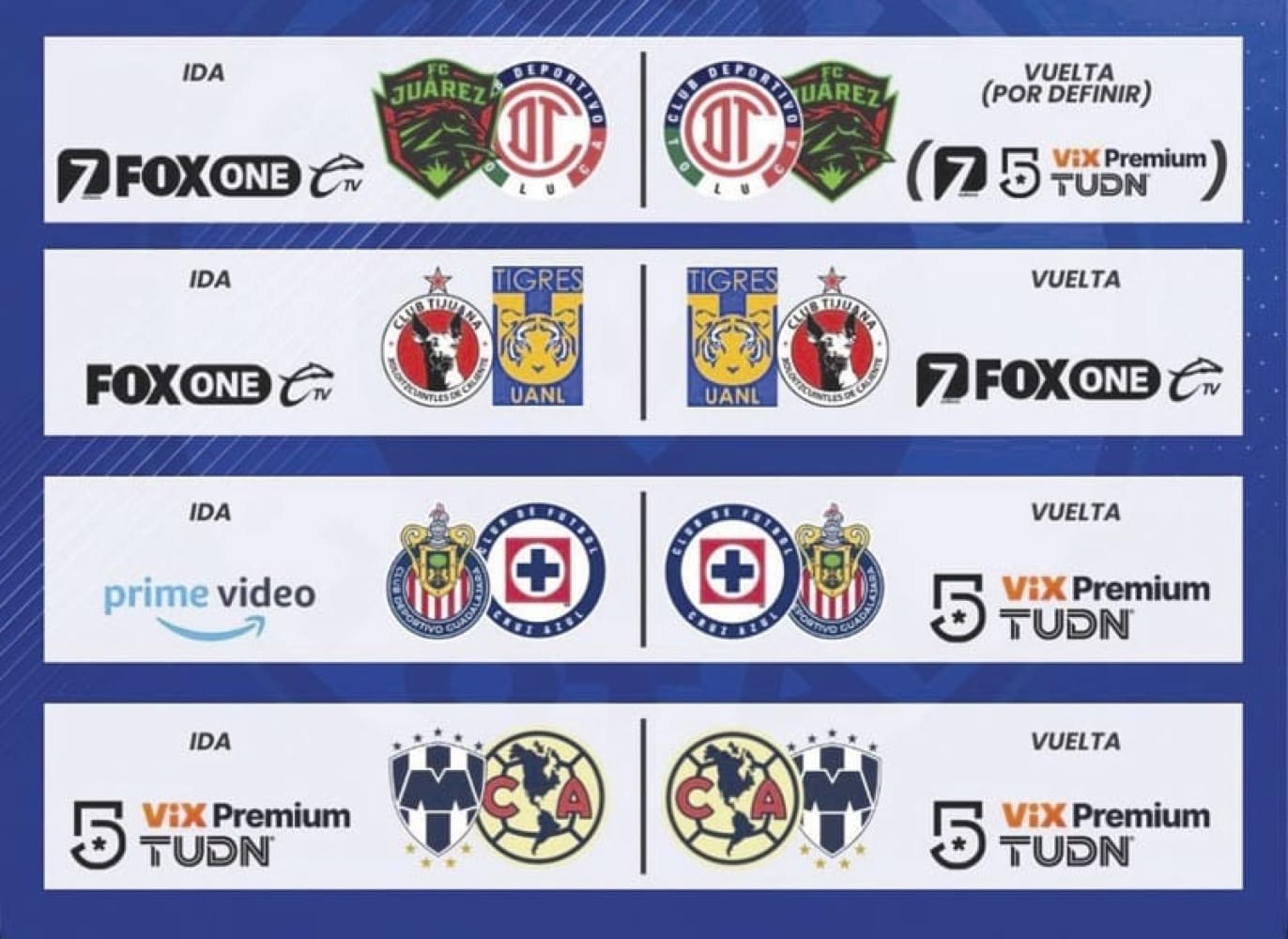 Mientras tanto el equipo de Cruz Azul tendrá como rival nada menos que a las Chivas Rayadas de Guadalajara, primero jugarán en la perla tapatía en el estadio Akron y la vuelta será en Ciudad Universitaria.