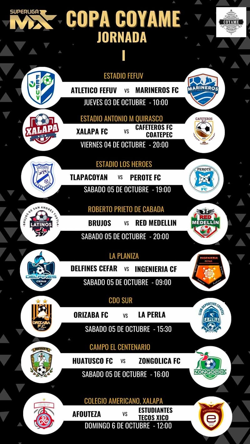 La actividad arrancará el jueves 3 de octubre a las 10 de la maña en el estadio de la Facultad de Educación Física donde la escuadra de FEFUV recibe a Marineros de Piedras, Xalapa FC recibe a Cafeteros de Coatepec el viernes a las 8 de la noche en el Antonio M. Quirasco.