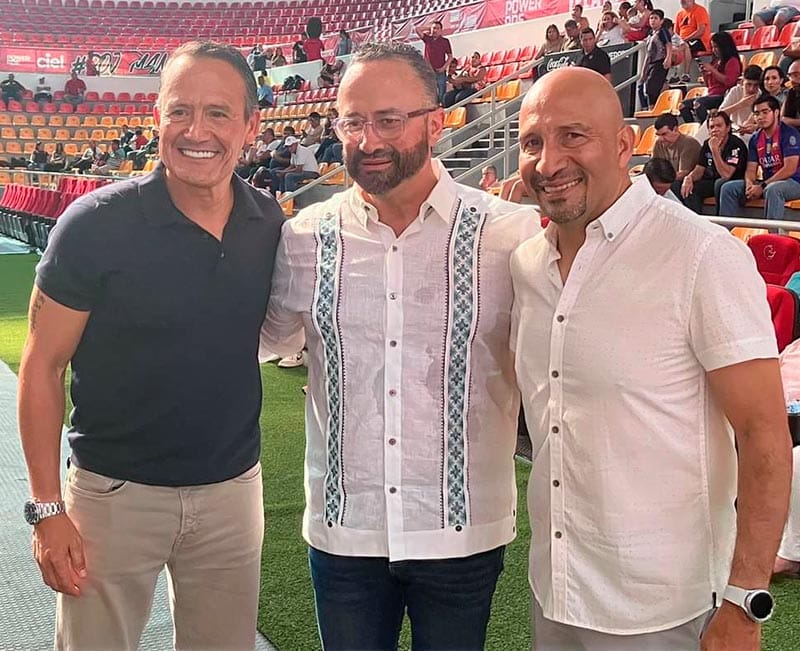 El presideente de la liga “Pirata Fuente” con dos grandes ídolos del futbol, Luis “Matador” Hernández y Oscar “Conejo” Pérez.
