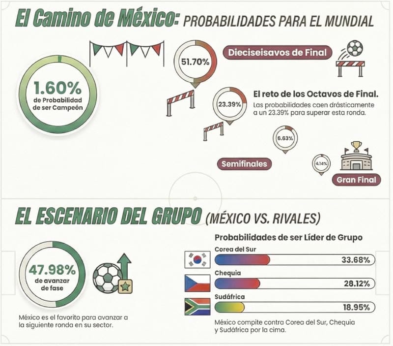 Según este sitio, que utiliza inteligencia artificial y datos en tiempo real impulsados por Stats Perform para hacer sus predicciones, el Tri pasará a los Dieciseisavos de Final ya que tiene 47.98 por ciento de posibilidades de avanzar, incluso como líder de sector ya que Corea del Sur tiene 33.68, Chequia 28.12 y Sudáfrica 18.95.