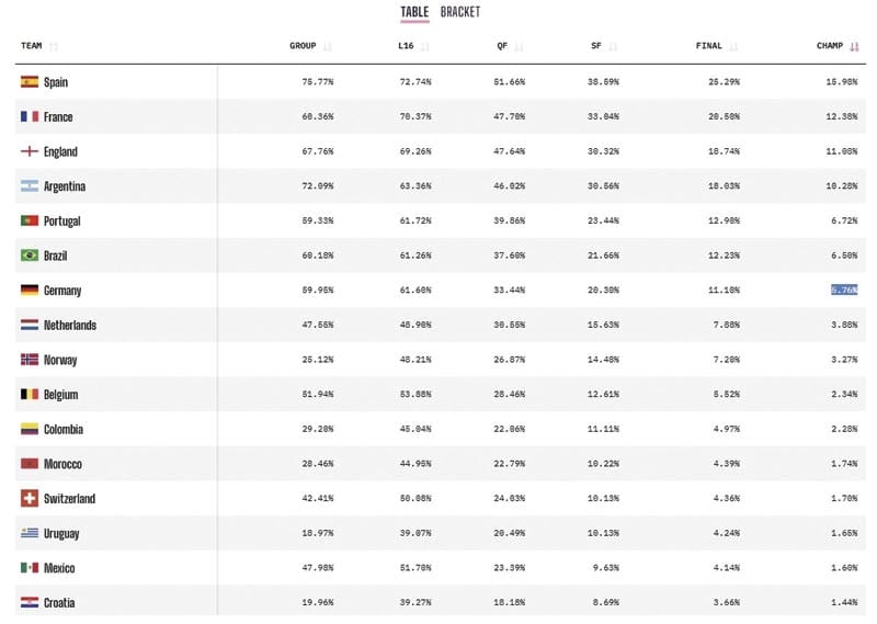 En general, España es el máximo favorito de ser campeón con 15.98 por ciento de las probabilidades, seguido por Francia (12.38%), Inglaterra (11.08%) y Argentina (10.28%).