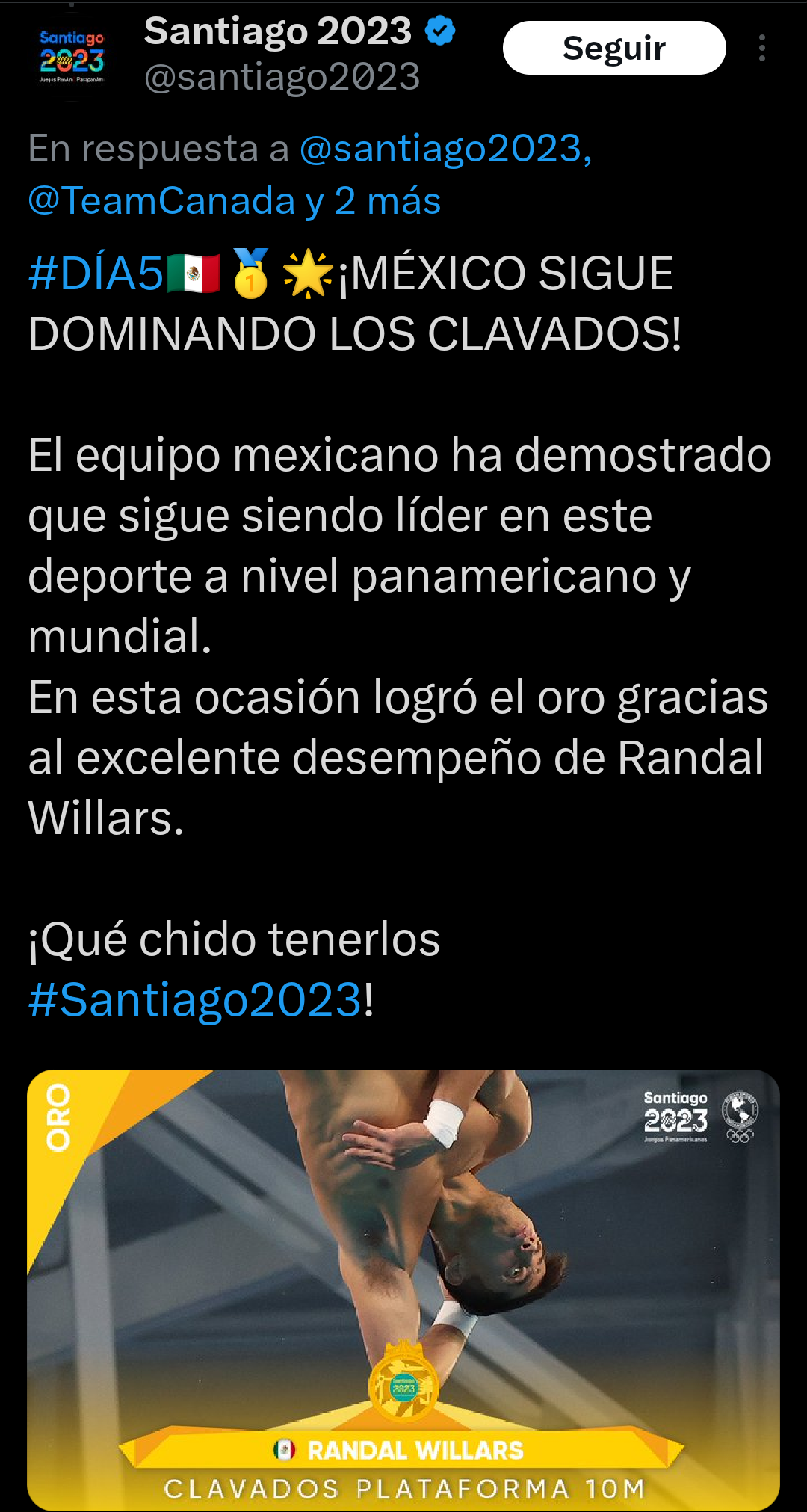 Randal Williars se consagró como bicampeón en los Juegos Panamericanos Santiago 2023 al ganar la medalla de oro en la competición individual. Hace unos días, ya había alcanzado la cima del podio en la categoría sincronizada junto al veracruzano Kevin Berlín.