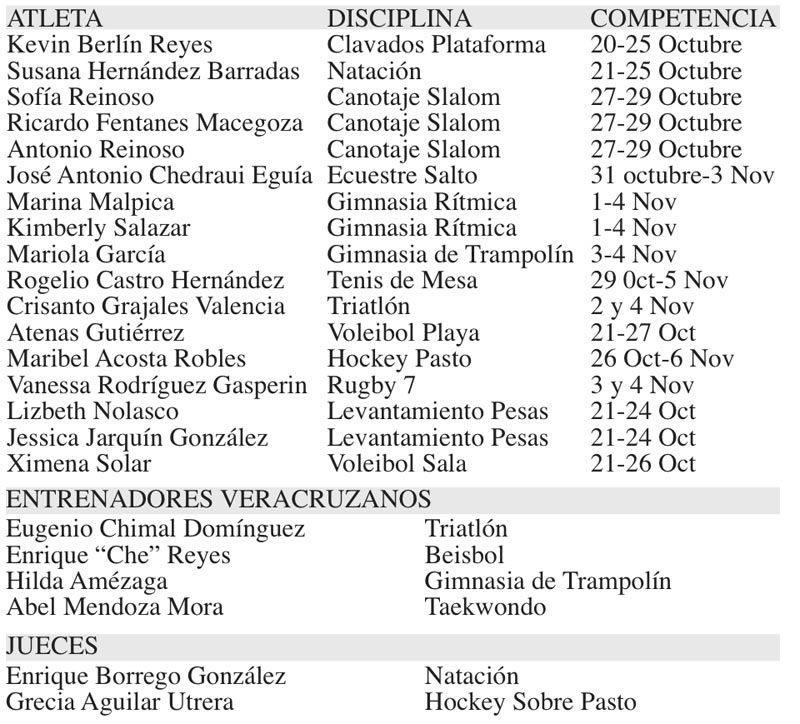 Las disciplinas deportivas en que participarán los veracruzanos son clavados, natación, canotaje slalom, ecuestre salto, gimnasia de trampolín, hockey sobre pasto, levantamiento de pesas, tenis de mesa, triatlón, voleibol de playa, gimnasia rítmica, rugby 7 femenil.