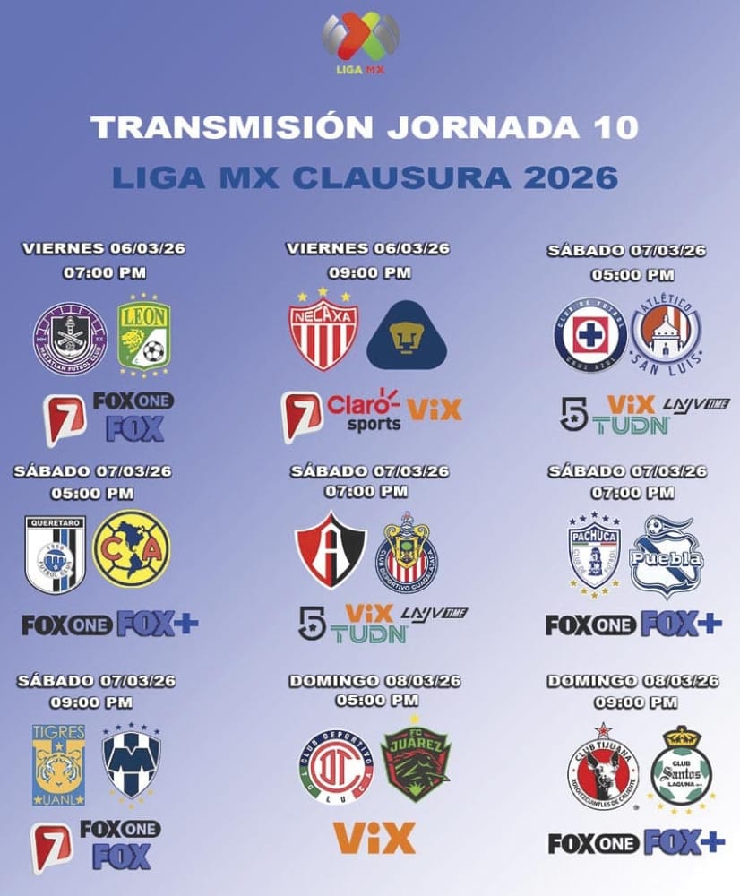Hay fecha doble en esta semana y hoy se pone ya en marcha la jornada 10 del Torneo Clausura 2026 de la Liga BBVA MX, serán dos encuentros los que se estén disputando en una jornada que se jugará de viernes a domingo.