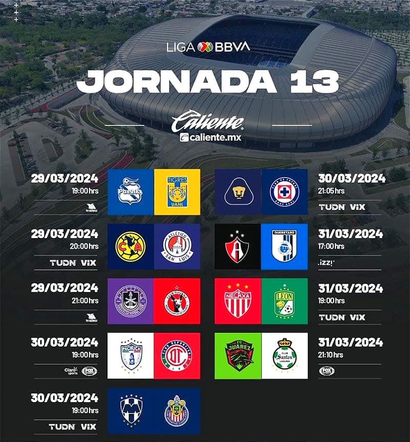 Este día se pone en marcha la cabalística fecha 13 del Torneo Clausura 2024 de la Liga MX, serán tres encuentros los que se tendrán en esta noche, en el Cuauhtémoc, en el Azteca y en El Encanto donde habrá actividad.