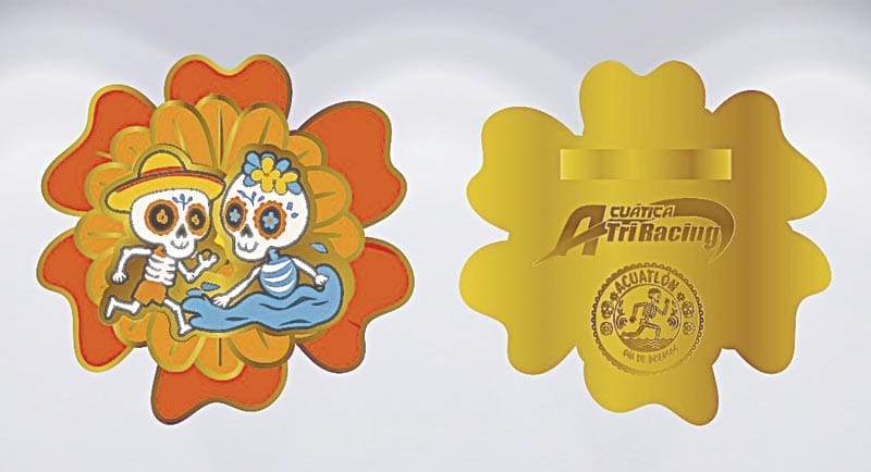 La medalla oficial del Primer Acuatlón del Día de Muertos destaca por su diseño vistoso y su fuerte simbolismo: