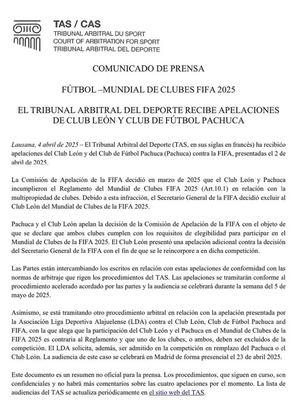 “Se está tramitando otro procedimiento arbitral en relación con la apelación presentada por la Asociación Liga Deportiva Alajuelense contra el Club León, Club de Futbol Pachuca and FIFA, con la que alega que la participación del Club León y el Pachuca en el Mundial de Clubes de la FIFA 2025 es contraria al Reglamento y que uno de los clubes, o ambos, deben ser excluidos de la competición. El LDA solicita, además, ser admitido en la competición en remplazo del Pachuca o el Club León. La audiencia de este caso se celebrará en Madrid de forma presencial el 23 de abril 2025”, indicó.