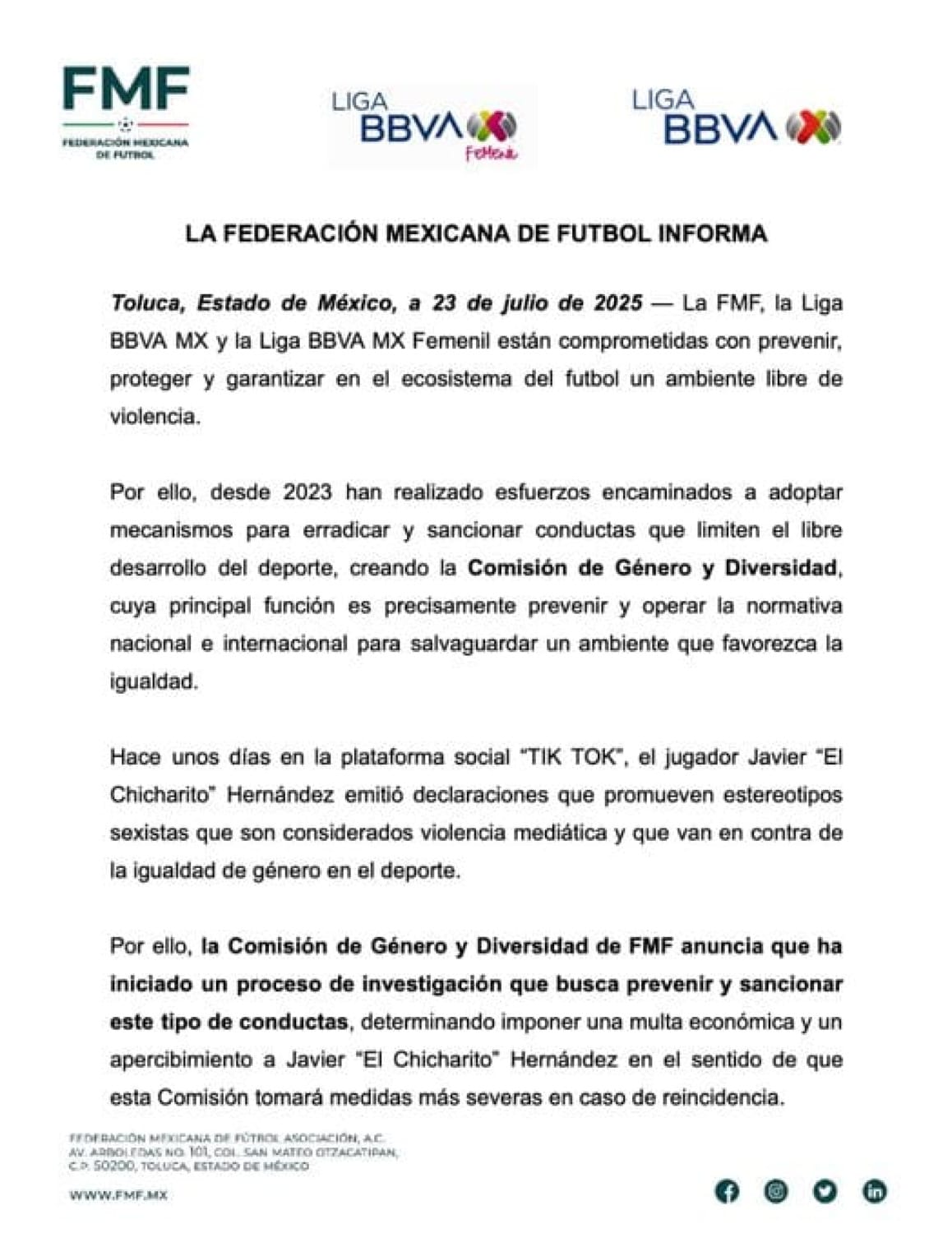 Por lo que precisó la FMF “Por ello, la Comisión de Género y Diversidad de FMF anuncia que ha iniciado un proceso de investigación que busca prevenir y sancionar este tipo de conductas, determinando imponer una multa económica y un apercibimiento a Javier “El Chicharito” Hernández en el sentido de que esta Comisión tomará medidas más severas en caso de reincidencia, concluyó el comunicado.
