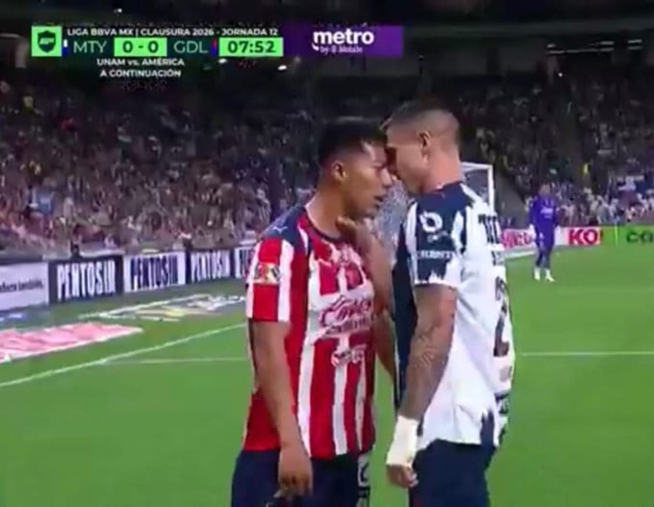La “Hormiga” González, que fue un dolor de cabeza para la zaga regia, recibió un codazo del defensa Carlos Salcedo que solamente recibió la tarjeta amarilla.