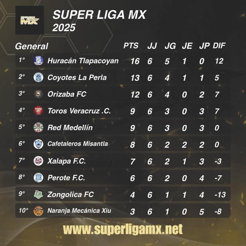 Tras jugarse la jornada 6 de la temporada 2025 de la Súper Liga MX, el equipo de Huracán de Tlapacoyan pudo mantener la cima, mientras que el campeón Orizaba goleó, por lo que está en la pelea.