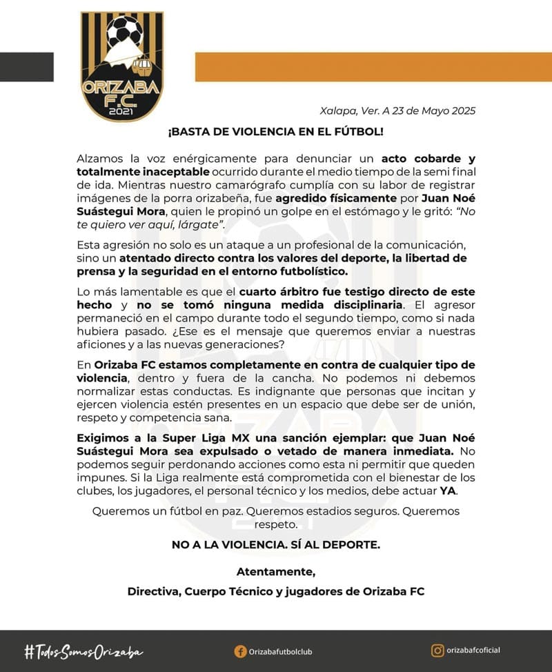 En tanto en su página oficial, el equipo Orizaba FC denunció la agresión de un integrante del cuerpo técnico de Xalapa, específicamente al encargado de medios del equipo albinegro: Basta de Violencia en el Fútbol, en Orizaba FC estamos completamente en contra de cualquier tipo de violencia, dentro y fuera de la cancha.