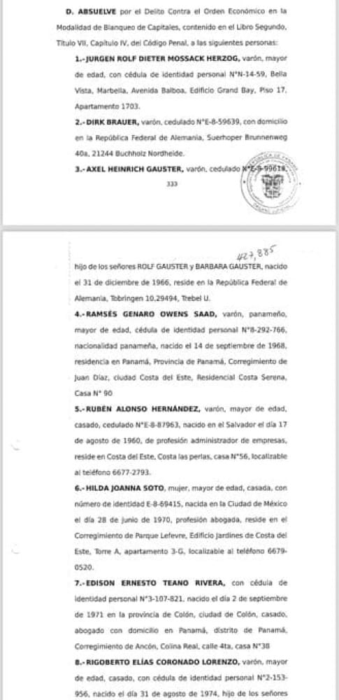 "La jueza Segunda Liquidadora de Causas Penales, Baloísa Marquínez (...) absolvió a 28 personas acusadas del delito Contra el Orden Económico en la modalidad de Blanqueo de Capitales, en las causas acumuladas de los casos denominados 'Panama Papers' y 'Lava Jato', seguido a la firma de abogados Mossack Fonseca y sus colaboradores, así como a ciudadanos de nacionalidad alemana", detalló el Órgano Judicial en un comunicado.