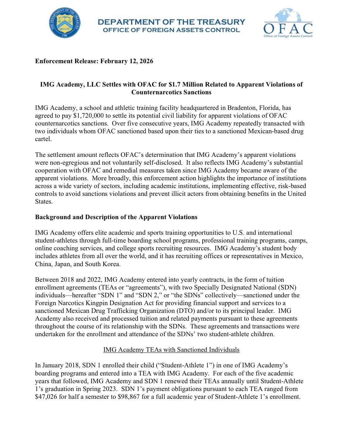 Dijo la Oficina de Control de Activos Extranjeros del Tesoro (OFAC, por sus siglas en inglés) sobre el acuerdo con IMG Academy.