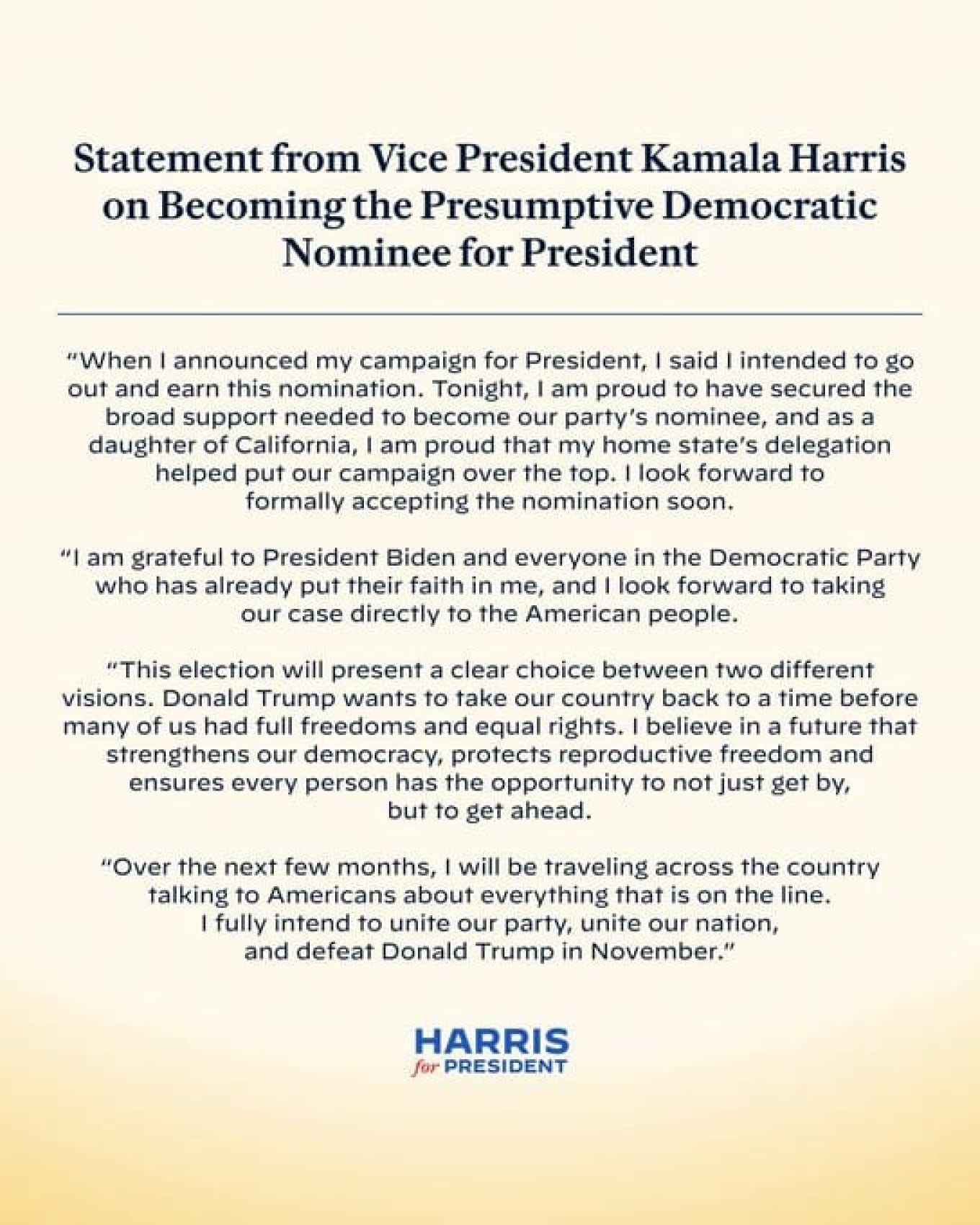 Eso se hace eco de la declaración que emitió tras el anuncio de Biden de hacerse a un lado.