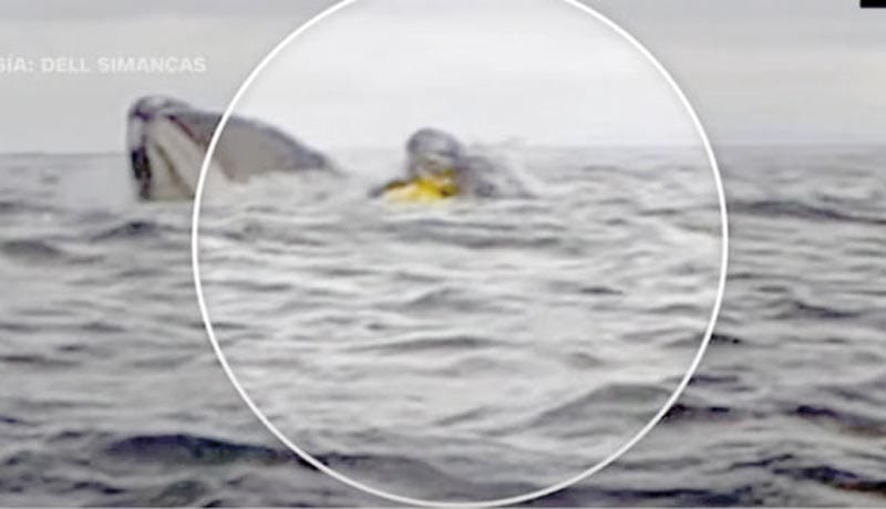 Adrián Simancas, de 24 años, estaba haciendo kayak con su padre, Dell Simancas, cuando el gigantesco animal apareció inesperadamente y atrapó al joven y su embarcación amarilla con sus fauces. Segundos después, tras liberarlo, el cetáceo siguió nadando.