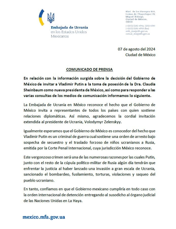 La Embajada ucraniana señaló que confía en que el Gobierno mexicano "cumplirá en todo caso con la orden internacional de detención entregando al susodicho al órgano judicial de las Naciones Unidas en la Haya".