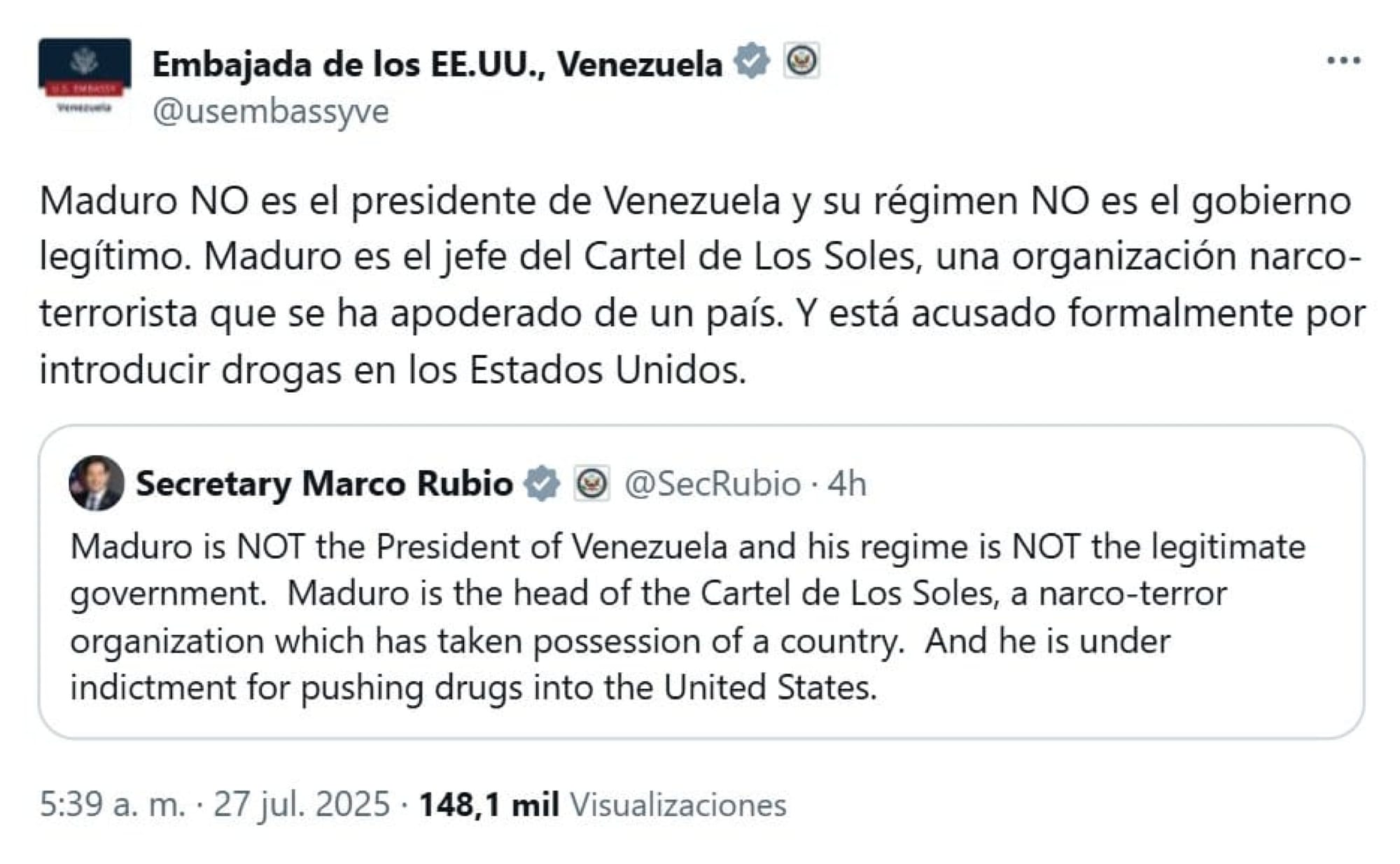 La Oficina de Asuntos del Hemisferio Occidental aseveró que el gobierno de Estados Unidos utilizará “los recursos a su alcance para impedir a Maduro de seguir beneficiándose mediante la destrucción de vidas estadunidenses y desestabilizando nuestro hemisferio”, pues aseveró que Los Soles apoya “terroristas que invaden nuestro país para traficar narcóticos, enriquecerse e infligir violencia en comunidades de Estados Unidos”.
