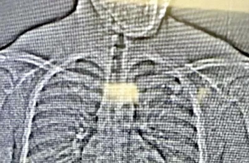 Una radiografía de su torso muestra lo que el Departamento de Policía de Orlando cree que son los aretes de diamantes: una masa blanca que brilla intensamente contra el fondo gris de su tracto digestivo.