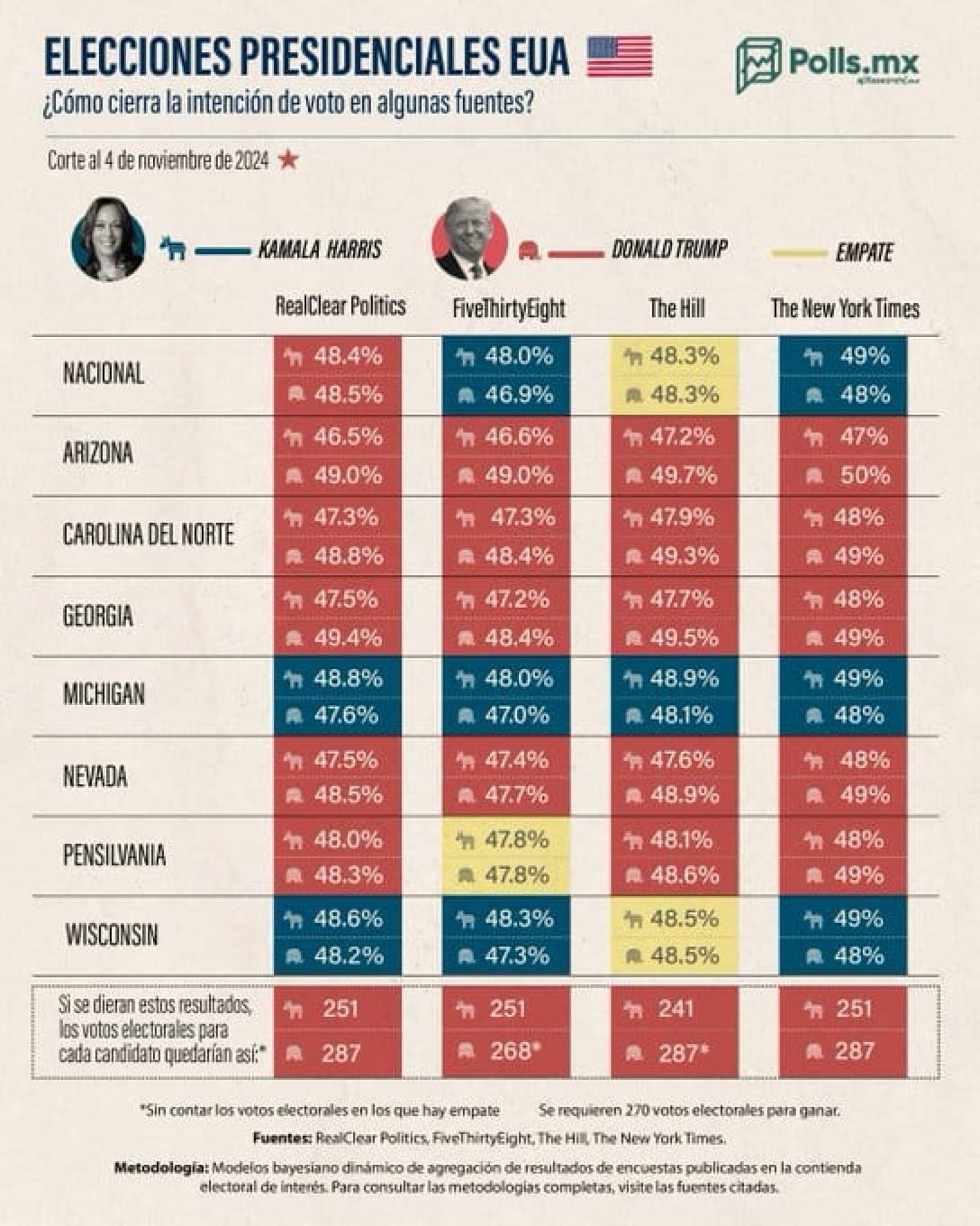 La moneda está en el aire y las encuestas no arrojan una posibilidad clara de triunfo para alguno de los dos candidatos. Según la investigadora de la Universidad de Indiana, Vanessa Cruz-Nichols, es posible que debamos esperar días o semanas por el resultado.