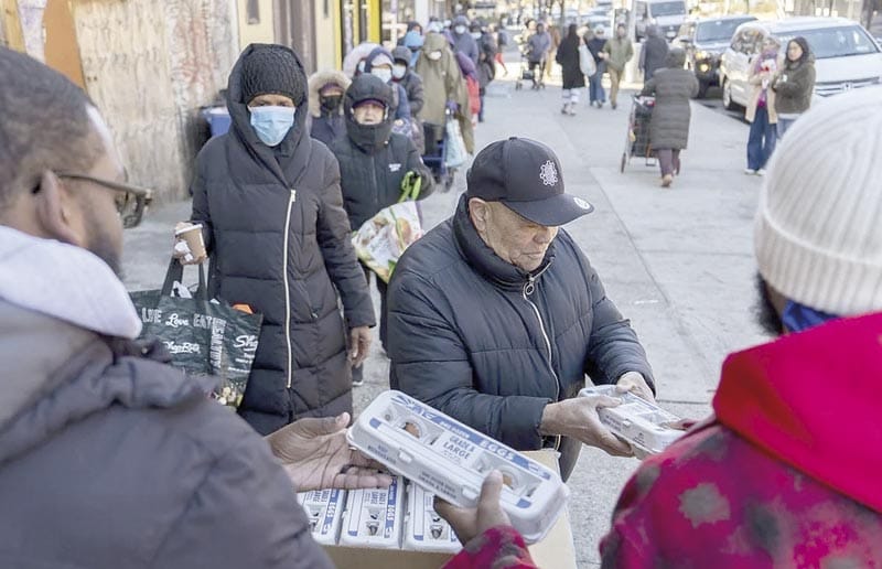 Las personas esperaron pacientemente afuera de un restaurante en Harlem, en un clima frío y ventoso, a que les entregaran un cartón con 12 huevos.